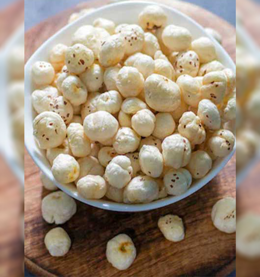 Makhana, also known as fox nuts or lotus seeds, is a nutritious snack widely consumed in India. Rich in protein, fiber, and essential minerals like magnesium, calcium, and potassium, makhana is low in calories and gluten-free, making it an ideal choice for health-conscious individuals. It is known for its anti-inflammatory and antioxidant properties, which help in promoting heart health and regulating blood sugar levels. Makhana is often roasted and lightly seasoned, providing a crunchy, flavorful snack. It is also used in various dishes like kheer (rice pudding) and curries, adding both texture and nutrition.